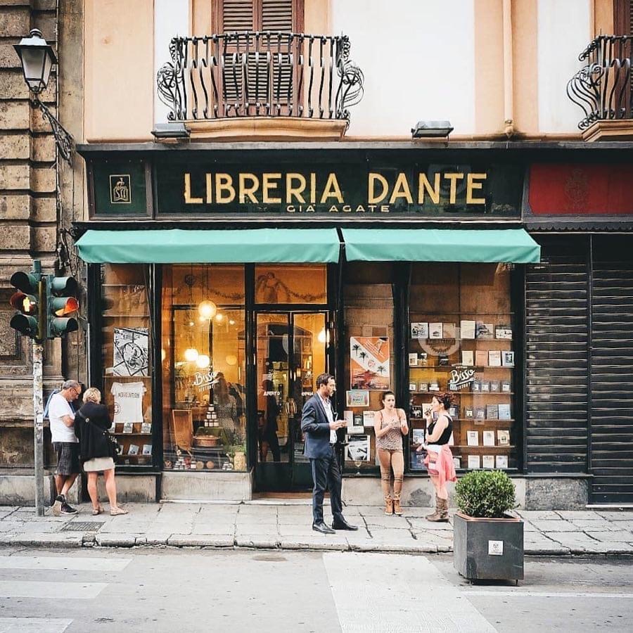 The Blue Salon in Palazzo La Bella Palermo. Below, Bisso Bistrot restaurant, in the former Libreria Dante bookshop, Palermo